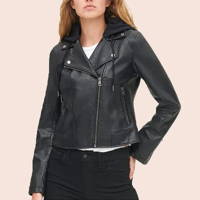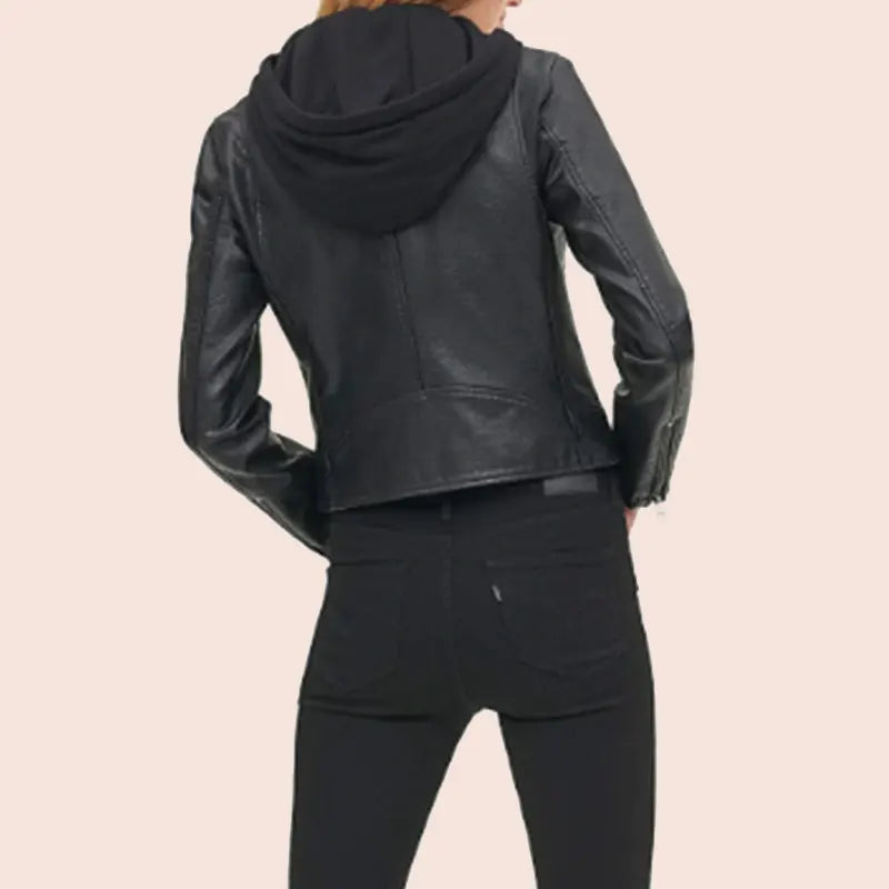 Womens Black Biker Hooded Leather Jacket