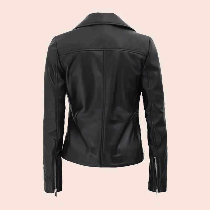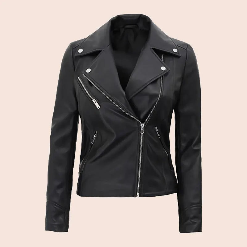 Discover the features of the Black Motorcycle Leather Jacket for Women! The expressed is made from genuine leather of the highest quality. In addition, a viscose lining has an interior edge that keeps the wearer warm and calm during the winter. You will get three zipped pockets, a wide lapel collar, an asymmetrical front zip closure, and its essential features.